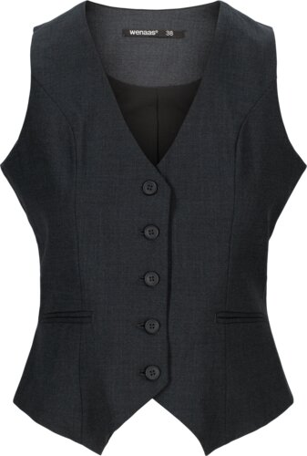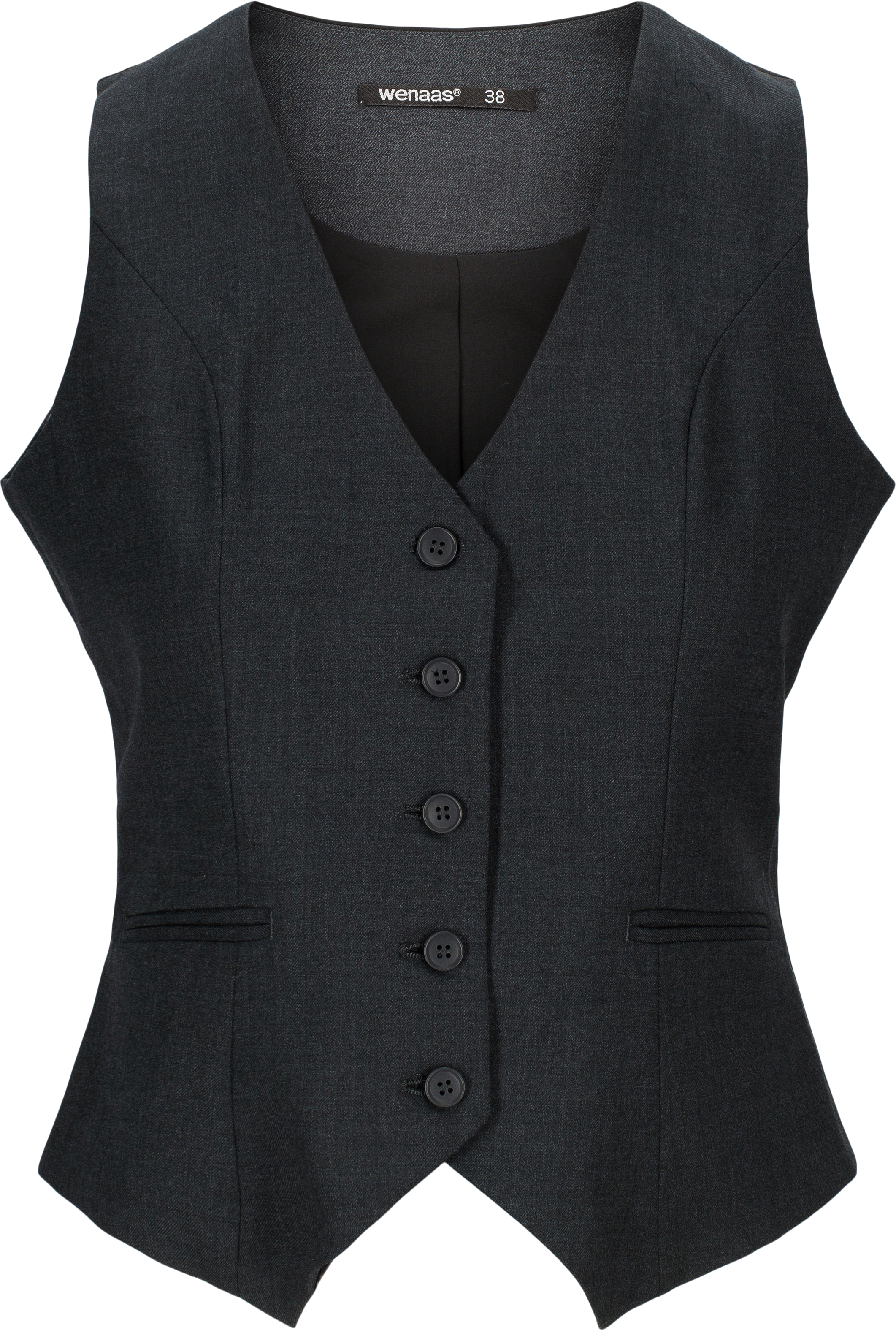 Women's tailored vest with stretch Comfortable vest with v-neck, princess seams in the front and back and two double besom pockets. Adjustable belt and double-layered elastic lining on the back. Closure with five buttons in the front.