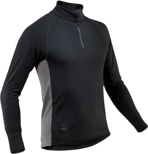 Flame-retardant, body-hugging, high neck with zip, long-sleeved, double-knitted in merino wool on the outside, comfortable Lenzing FR® on the inside against the skin, contrasting grey colours at the side.