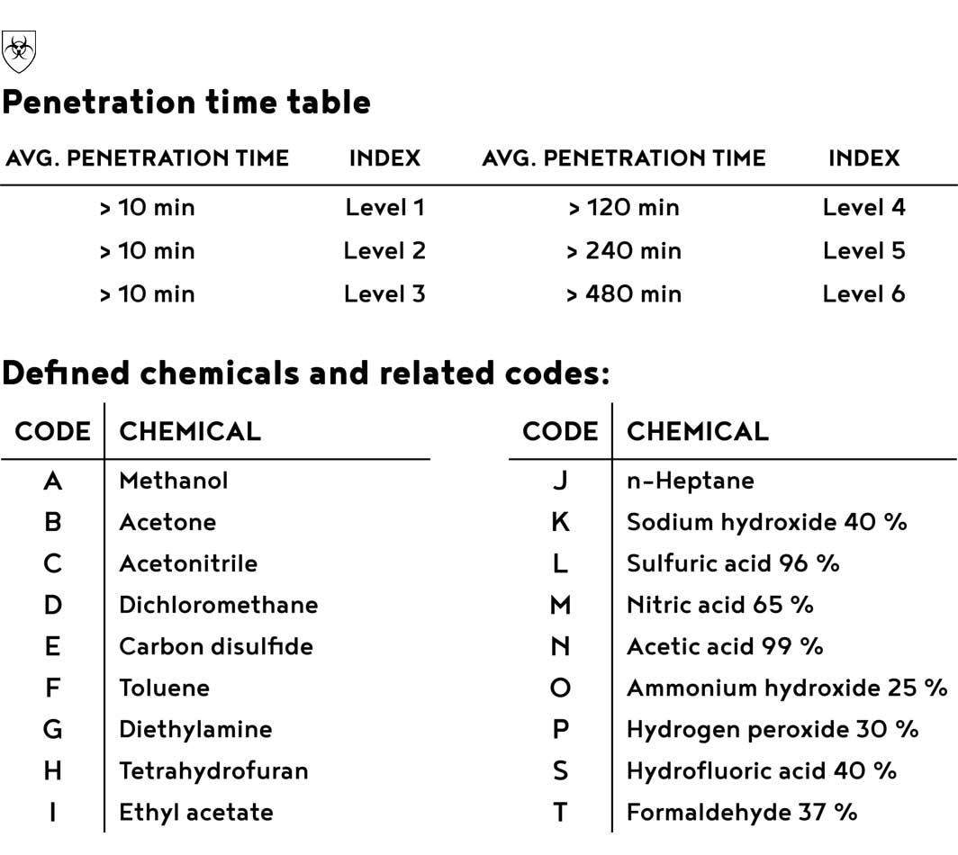 The chemical resistance table (including breakthrough time and degradation) should always be consulted before use.