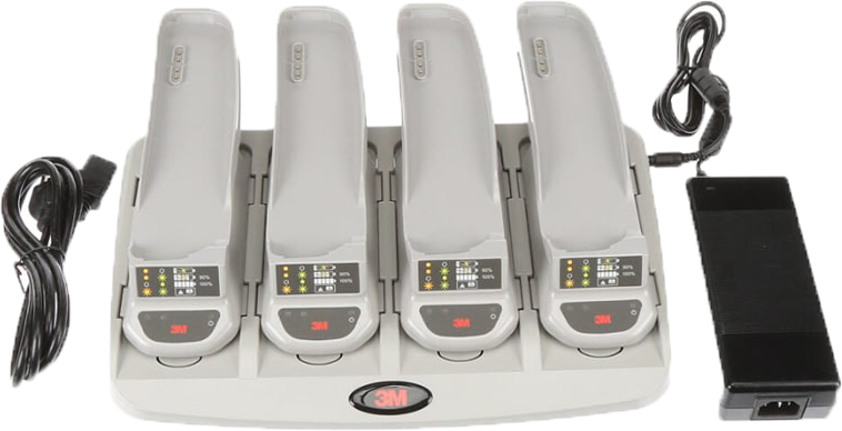 The battery charger TR-644E can charge up to 4 batteries at the same time. Batteries may be stored on the charger, fully charged, ready for immediate use. It consists of four TR-640 cradles, a baseplate, power supply and cable.