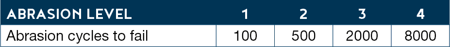 In the European standard EN388, circular samples of the material are tested under a constant pressure of (9.0 ± 0.2) kPa, approximately 435g weight load. The resistance to abrasion is measured by the number of rubs required for breakthrough. Four samples should be taken from four different gloves of the same glove series. The performance level is defined as the lowest of the four values.