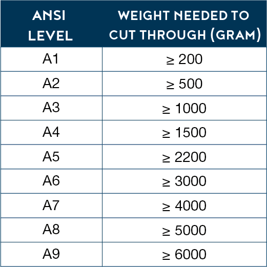 In the USA, the ANSI/ISEA 105 standard includes a test with a scale of 9 levels of cut resistance, A1-A9. The levels indicate how many grams are required to cut through a sample using a rectangular blade in the specified cut test machine.