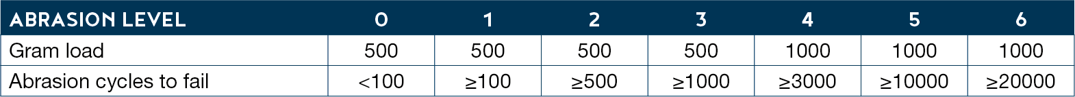 The American standard ANSI/ISEA 105-2016 for abrasion testing evaluates how many cycles are required for an abrasion wheel to break down the glove material. For levels 0 to 3, a load of 500 grams is applied to the abrasion wheel, while levels 4 to 6 use a load of 1000 grams. The glove material is mounted and abraded by the rotating wheel until a hole form under the corresponding weight. The more cycles it takes for the material to break down, the higher the abrasion rating. The classification level is reported as an average of at least five samples.