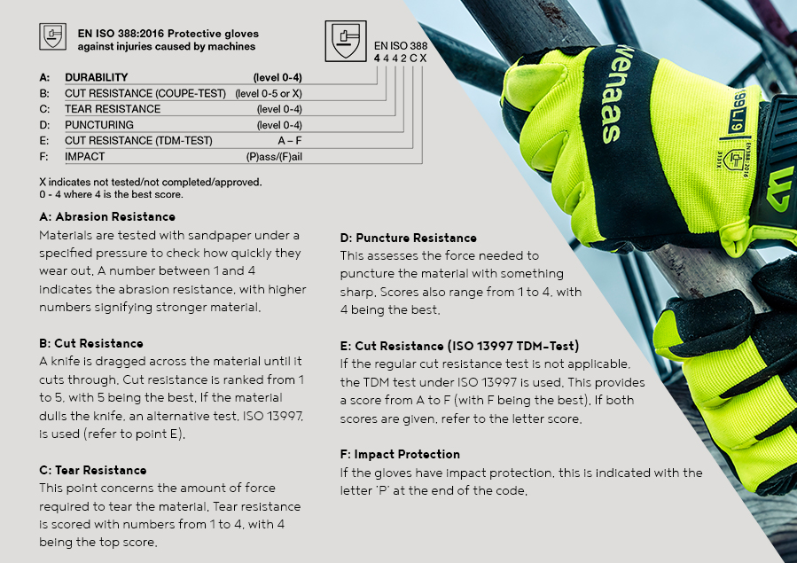When choosing work gloves that protect against cuts, it can be helpful to understand both the European and American classification systems for cut resistance, as many gloves will display both markings. It is important to remember that due to different testing methods, ANSI and EN 388 cut resistance results do not always match based on cut load. Work gloves that protect against cuts have a tight fit, high abrasion resistance, and are often made from knitted material that contains fiberglass.