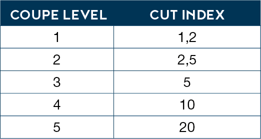 The European standard includes two different tests: the TDM-100 test (the same machine used by ANSI), where the levels (A-F) indicate the force in newtons (N) required to cut through a sample using a rectangular blade in the cut test machine. This test is optional unless the blade in the Coupe test becomes dull, in which case it becomes the reference for cut resistance. The Coupe test is more complex. A glove is assigned a cut level from 0 to 5 (where 5 is the most resistant to cuts) based on the material's "cut index." The cut index is a ratio that compares the material's cut resistance to the cut resistance of a reference cotton fabric.