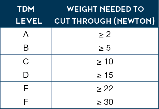 This straight blade test is used when the circular blade test cannot be applied. The straight blade test measures the applied vertical force and the distance required to cut through the glove with the standardized blade. After each cut on the sample, a new blade is used, and the force increases the performance level, which is rated from A to F, with F being the highest level of cut resistance.