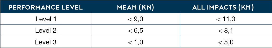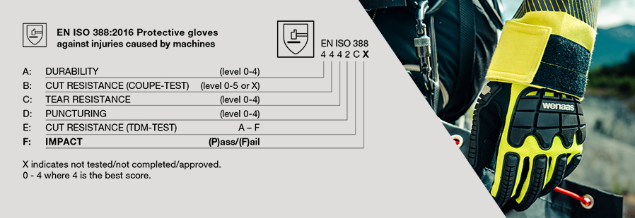 EN 388 only tests impact on the knuckles, back, or palm, where 4 different gloves are tested. Fingers are not tested. The EN 388 test is given a simple pass (P) or fail (F). X indicates not tested/not applicable/approved. To pass, the average transmitted force from the 4 tested gloves must be less than or equal to 7 kN, with no individual results greater than 9 kN.