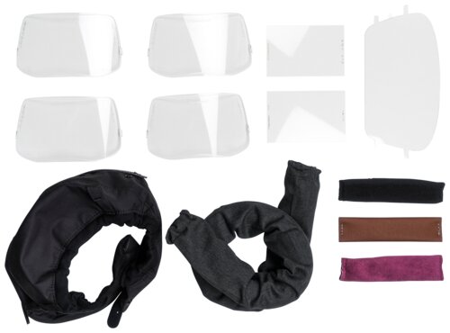 Accessory set for the 3M G5-01 Speedglas Welding shield. Contains 3 types of sweatband: cotton fleece, terry and leather, two inner protective glass shields and fire-standard protective out glass shield, one clear face shield, protector for the breathing hose, and a face seal.