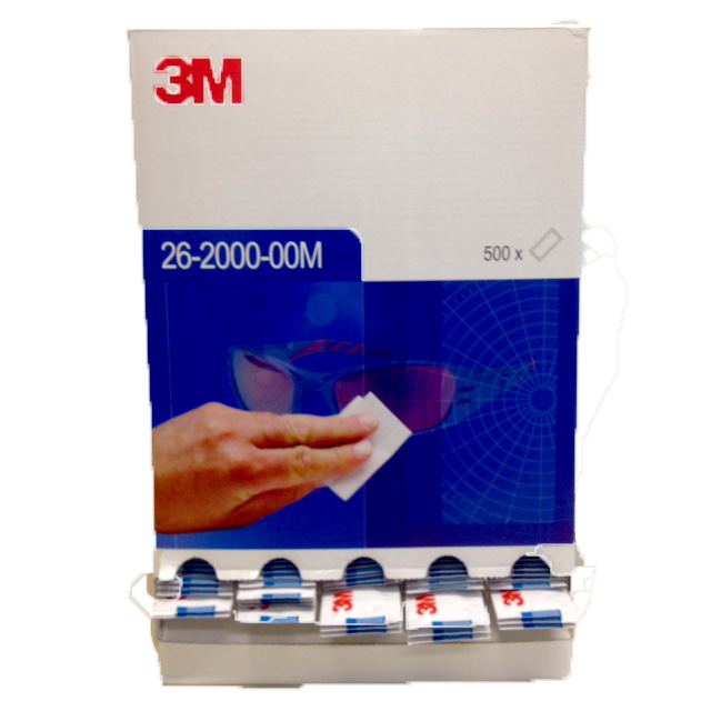 Dispenser with 500 packs of wet wipes for cleaning eyewear. They are pre-moistened with cleaning solution. Each wipe is individually wrapped to retain moisture.