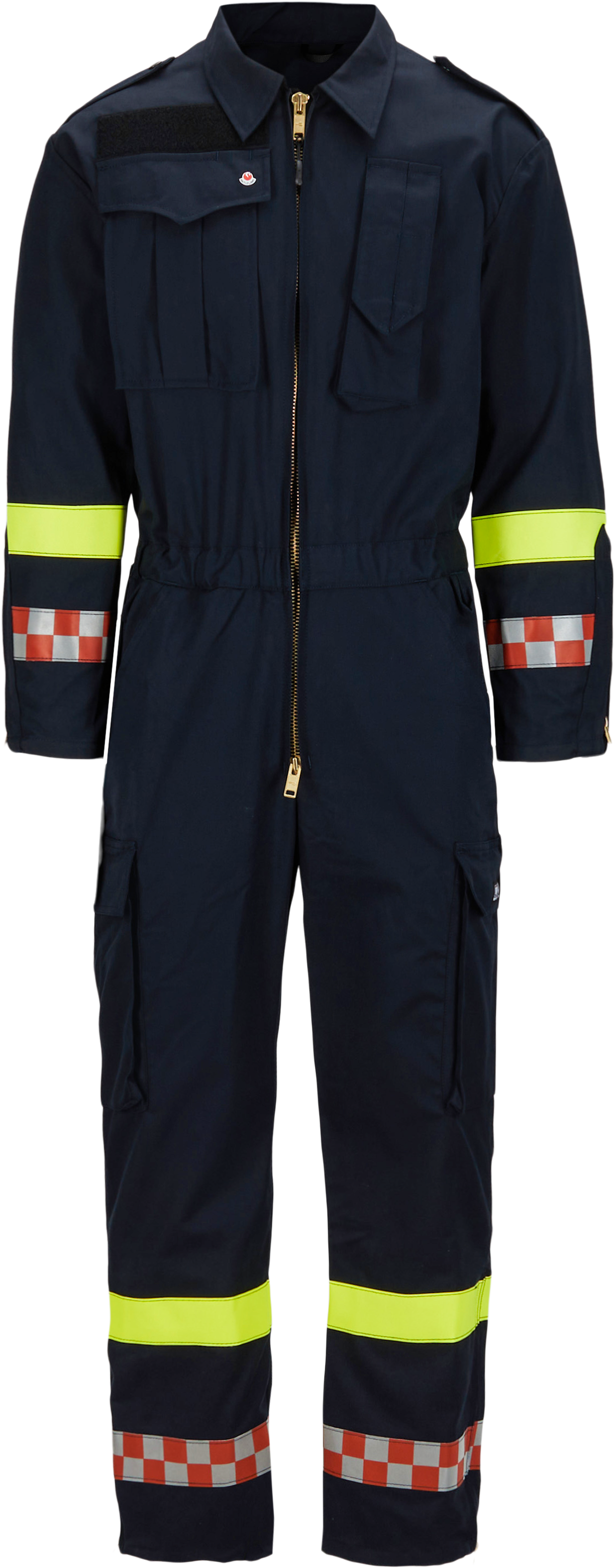 Classic uniform coverall with flame-retardant properties, for use in fire safety occupations. This coverall also provides protection against molten metal. Shoulder tabs with concealed press-studs, support panel at back with pleat, and two-way metal zip at front. Many practical pockets. Wedge panel under arms for increased freedom of movement. Adjustable waist with elastication ensures good comfort. Adjustable sleeve cuffs and leg hems. Suitable for fire and rescue work.Show less