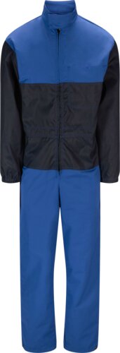 Waterproof fabric on sleeves and at front, collar with Velcro closure, zip at front, and elastication at waist and sleeve cuffs. Press-stud adjustment at leg hems. Inner pocket and back pocket.