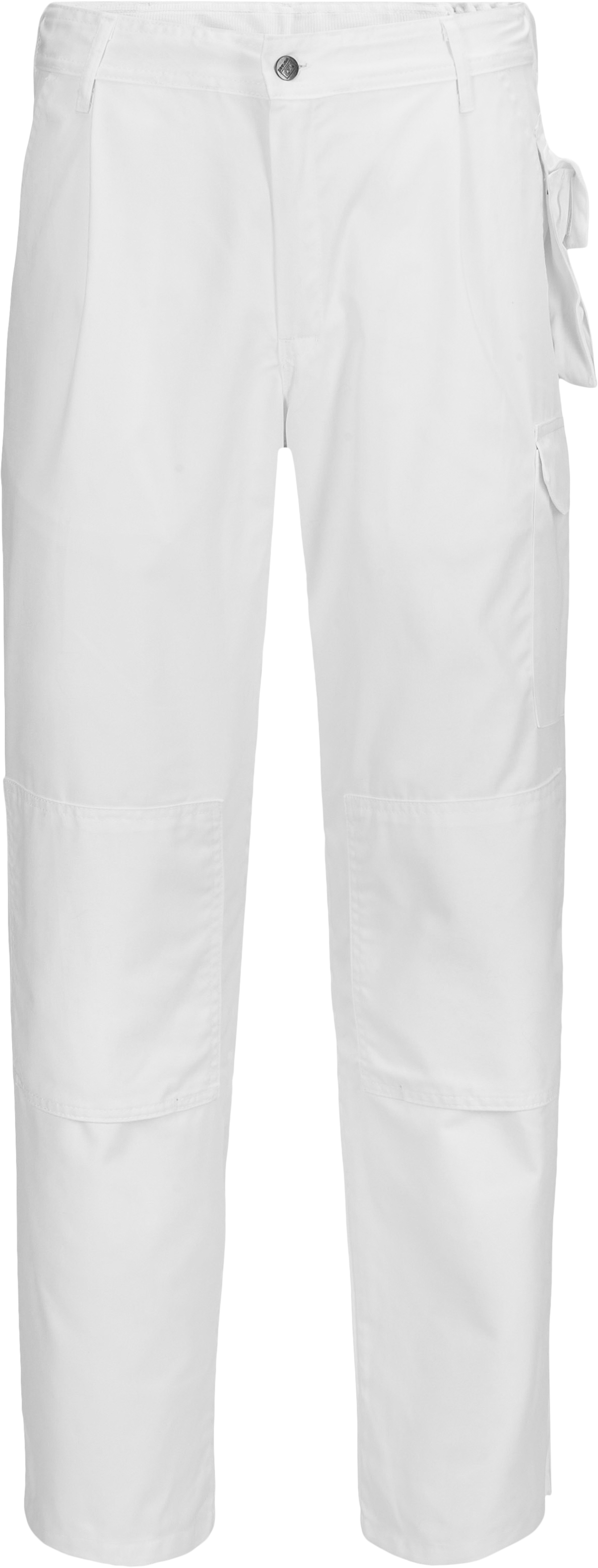 Work trousers with elastication in waist and pleats at front. Two front pockets, two pack pockets, hanging mobile phone pocket at left side, tool pocket, thigh pocket with flap, and knee-pad pockets.