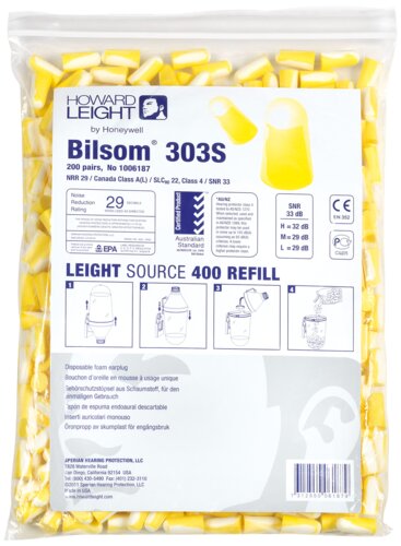 Earplug Bilsom 303S, small size, in refill bag, light weight, conical and rounded top, which simplifies insertion in ear canal. Soft foam deliveres superior user comfort, and solid performance. Carton: 10 bags of 200 pair.