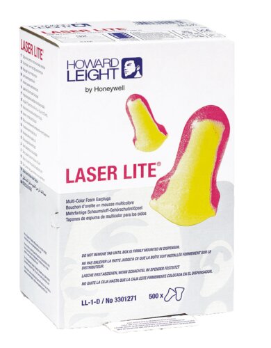 Howard Leight Laser Lite earplugs in a refill box. In hi-vis yellow and magenta for easy identification. Expand softly in the ear canal for an excellent fit over time. T-shaped for easy insertion and removal. One pair per bag. Package with 4 boxes containing 500 pairs each.