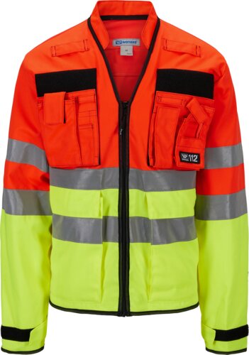 W112 vest jacket with small collar, zip in front, shoulder flaps, radio loop in front on both sides, 5X14 cm velcro strips for ID badges, removable mobile phone pocket right chest, removable radio pocket with window on left chest, front pockets with flap, extra internal mobile phone pocket in front pocket and vertical hem right side. Adjustable long sleeves, internal and external width adjustment, external hem at the back, breathable fabric on the back and space for a removable text panel on the back. Double reflective stripes around the body and sleeves, single reflective stripes above the text panel on the back.