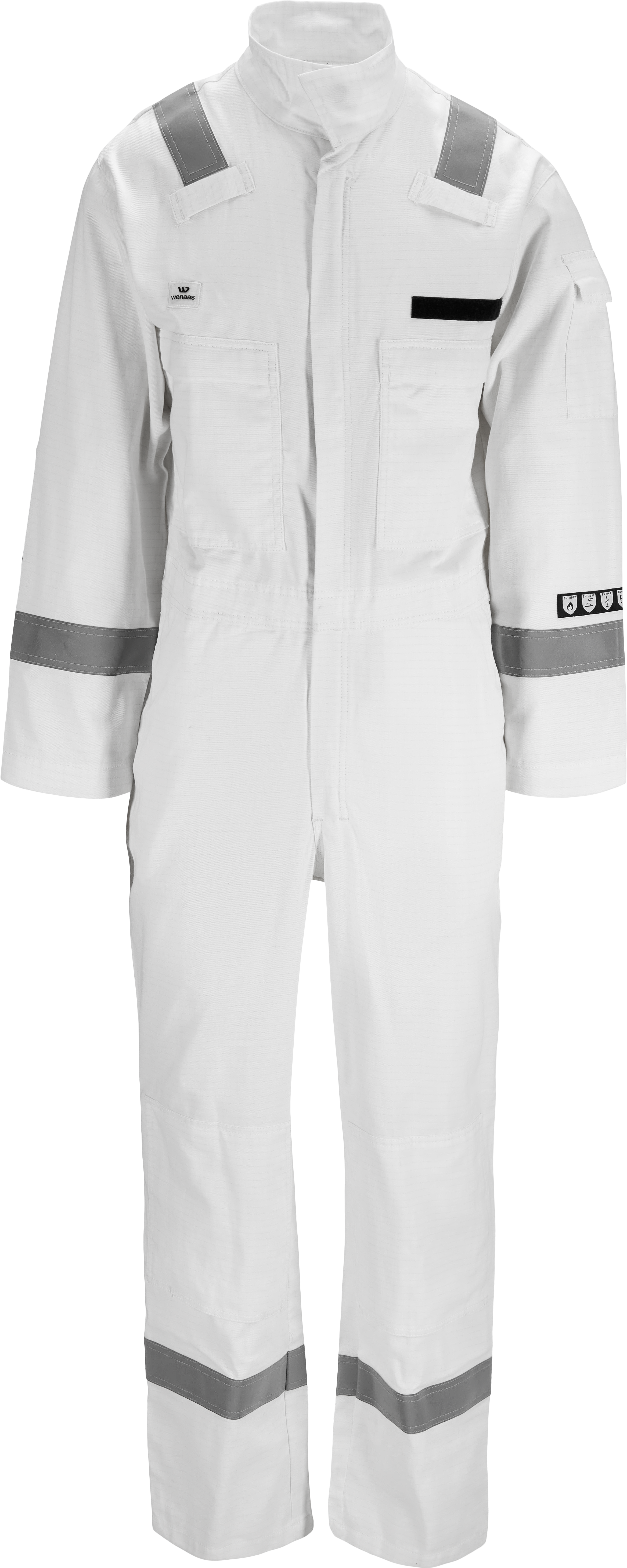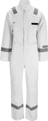 Lightweight and flame-retardant coverall that combines comfort, freedom of movement, and functionality. Featuring a stand-up collar, two-way zipper under a front flap, and an elasticated waistband, it offers a secure fit and easy on/off. Practical pockets including knee pad pockets and reflective bands around the arms, legs, and shoulders ensure functionality and visibility in demanding work environments.