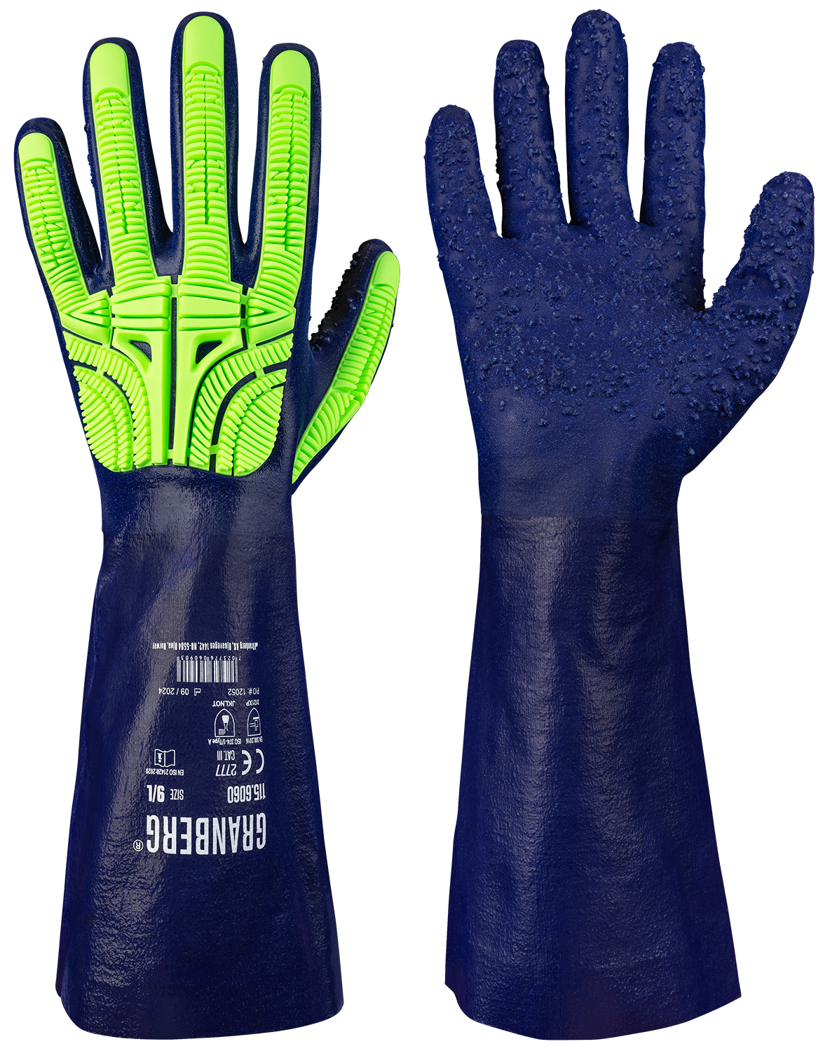 Nitrile coating with heavy granulate on palm and fingers, sweat-absorbing cotton lining, protection against chemicals and oil-based drilling fluids, soft and flexible with high durability, improved oil grip with specially designed nitrile granulates, ergonomically designed pinch protection on the back of the hand, high fingertip sensitivity that reduces fatigue
