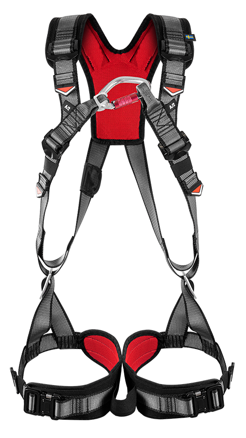 Breathable padding, quick-connect buckles, adjustable straps, galvanized side D-rings, PVC coated D-ring on back, aluminium carabiner in front, FID tag, 140 kg user weight.