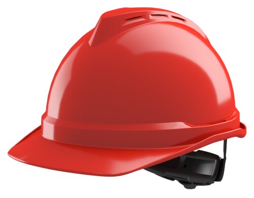Unventilated 1000-volt safety helmet from V-Gard. 4-point Fas-Trac® III ratchet suspension with PVC comfort band. Integrated peak and rain channel. Protection against lateral deformation (LD). Size 52–63 cm.