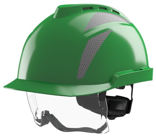 Unvented 1000-volt helmet in a dynamic design with silver-coloured reflectors for added visibility. 6-point Fas-Trac® III ratchet suspension with a foam comfort band. Integrated glasses with a rubber seal. Short peak and rain channel. Protection against lateral deformation (LD), down to -30 °C, against molten metal (MM), 440 V AC, and 1000 V AC. 30-mm slot for attachment of accessories. Weight 500 g. Size 52–63 cm.