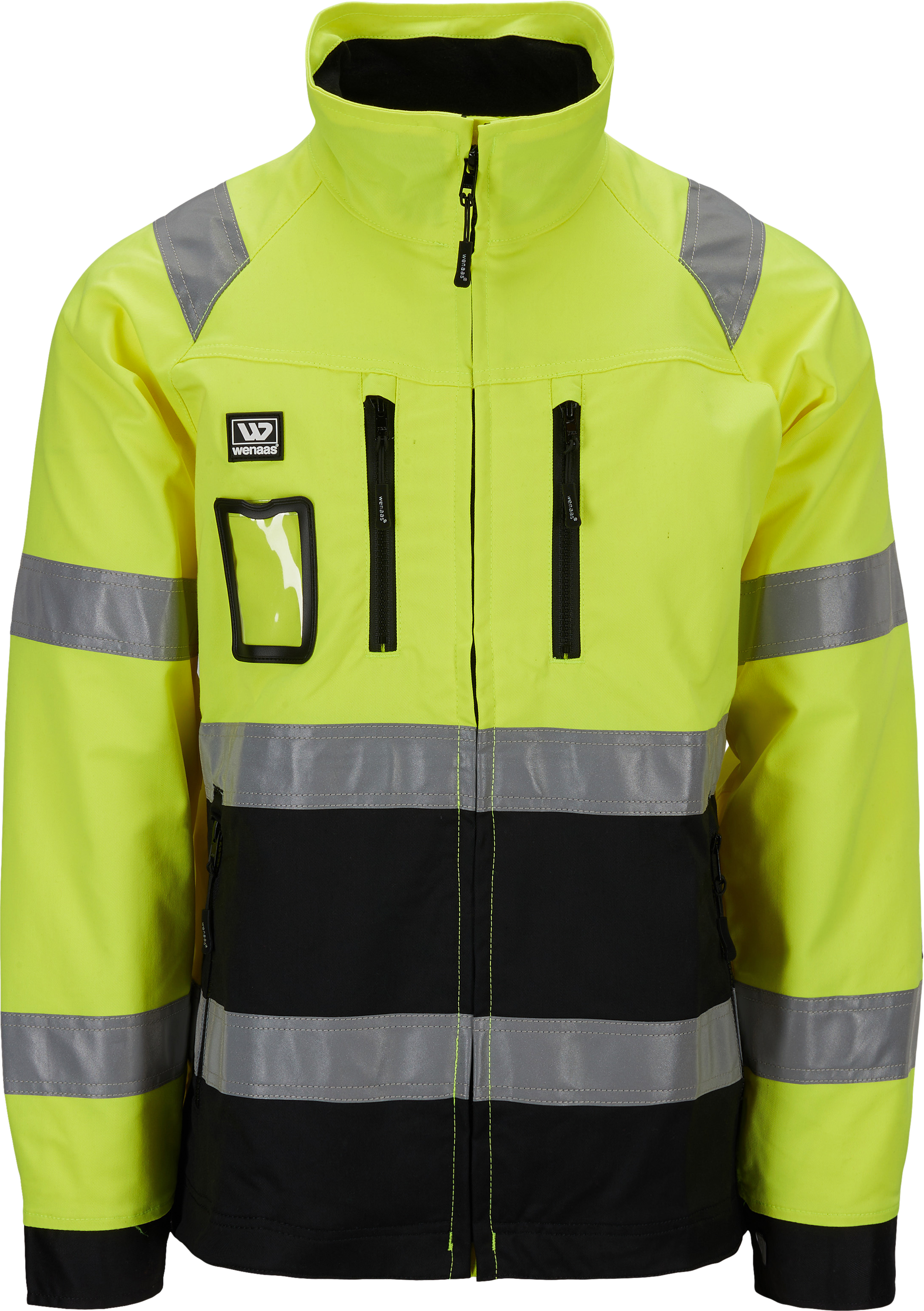 Visibility jacket in durable fabric. Comfortable fleece in the collar. Flap behind front zipper and several practical pockets. Adjustable cuffs and extended back to keep warm. This jacket can be used year-round.