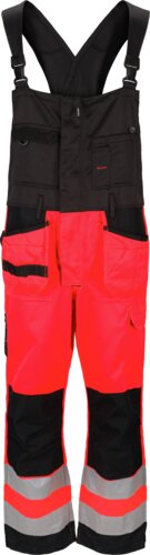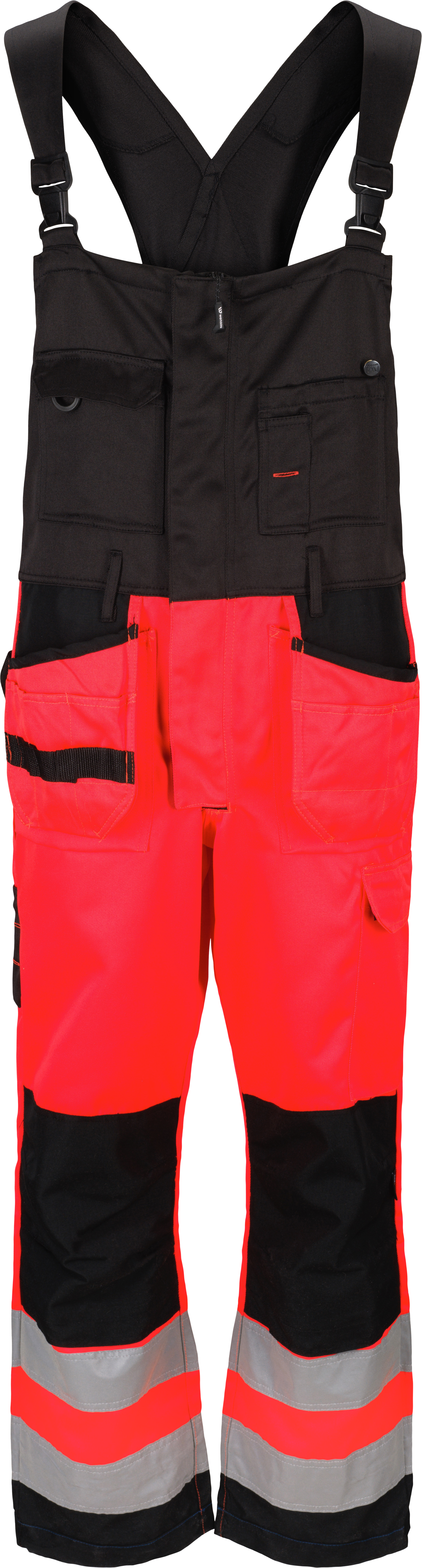 Bib'n'brace with a high front and zipper closure under the front flap. High back, adjustable straps with quick-release closure at the front, and belt loops around the waist. Multiple practical pockets and adjustment options.