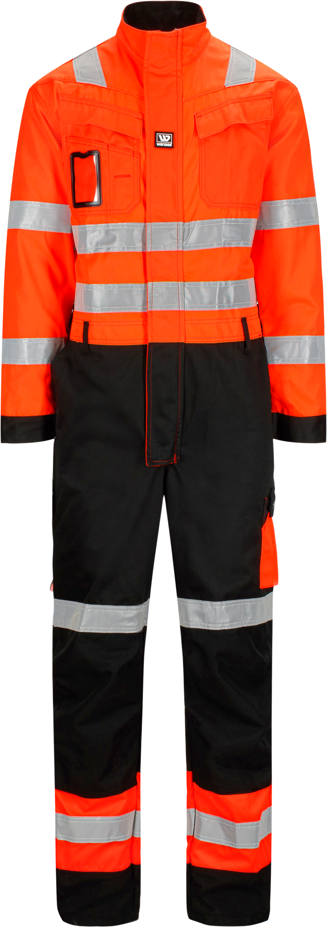 This model has a standing collar and 2-way zip under a front flap. Yoke at the front, and a pleat in the back for better movement. This coverall has a single, and a double chest pocket with a flap, an ID-card pocket, front pockets with grip-opening, a back pocket, with a hammer-loop under the back pocket tool pocket, with a pen pocket, WEB band, and a metal button for a knife. Double hip pocket with flap, and knee pad pockets with 2 levels for different knee pad sizes. Elastic at the back of the waist, big hammer loops with velcro and belt loops. Adjustable sleeves with cuffs and gusset, adjustable legs, double reflective tape around sleeves, body, legs, and single reflective tape across shoulders. Show less