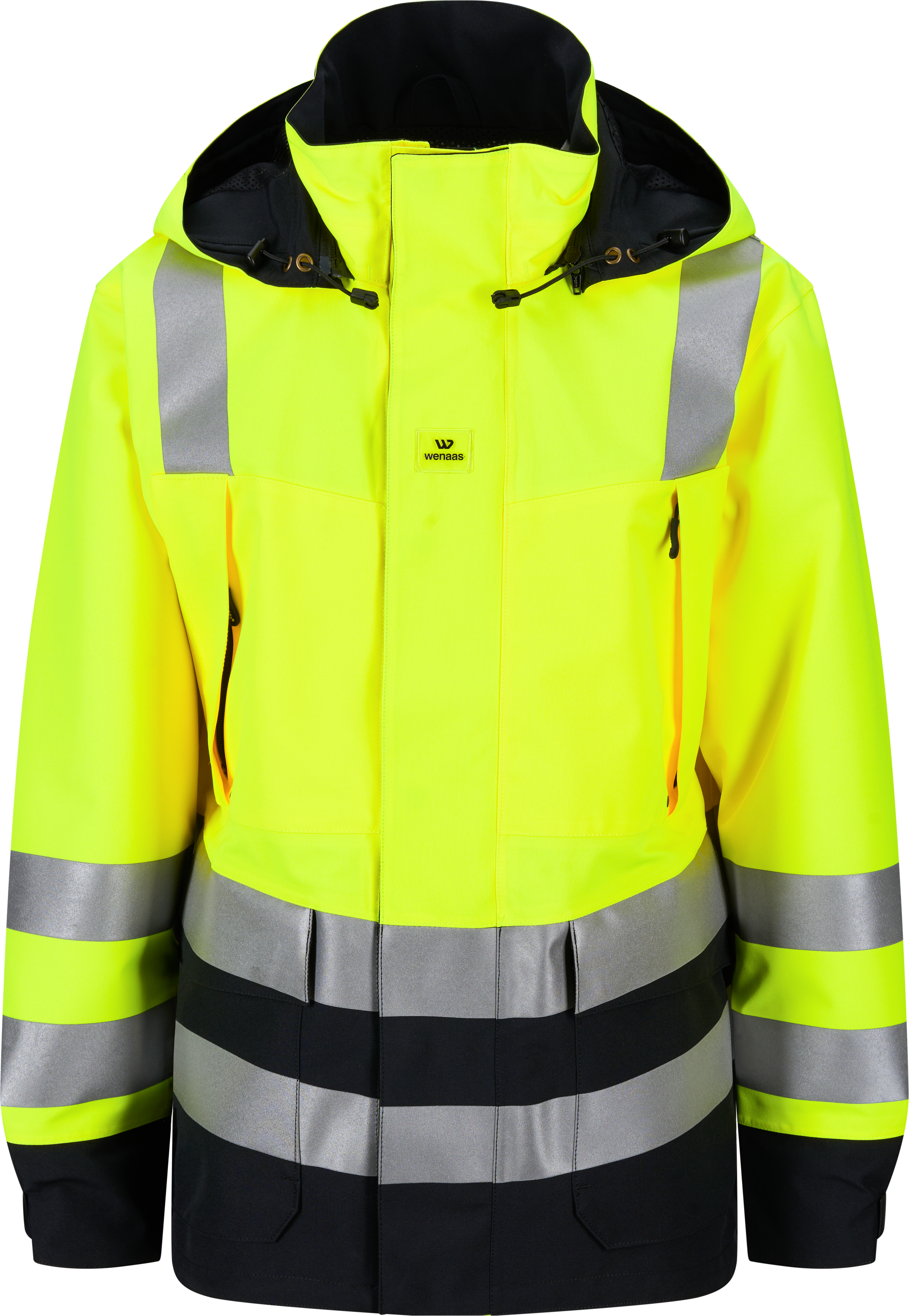 Hi-vis jacket, wind- and waterproof, breathable two-layer Gore-Tex® material, adjustable zip-off hood and a 1-way zipper under a double front flap. Map pocket with zip, and inside cell phone pocket. Chest pockets with zip cover by flap, and front pockets with flaps. Adjustable sleeves and bottom hem. Elastic cord with tightener in the hemline, both sides. Thin polyester lining inside sleeves and bottom fronts of the jacket. Mesh lining at the top of the back and inside the hood. Zipper in lining at the bottom under small flap for easy access. Reflex at sleeves, body and shoulders.