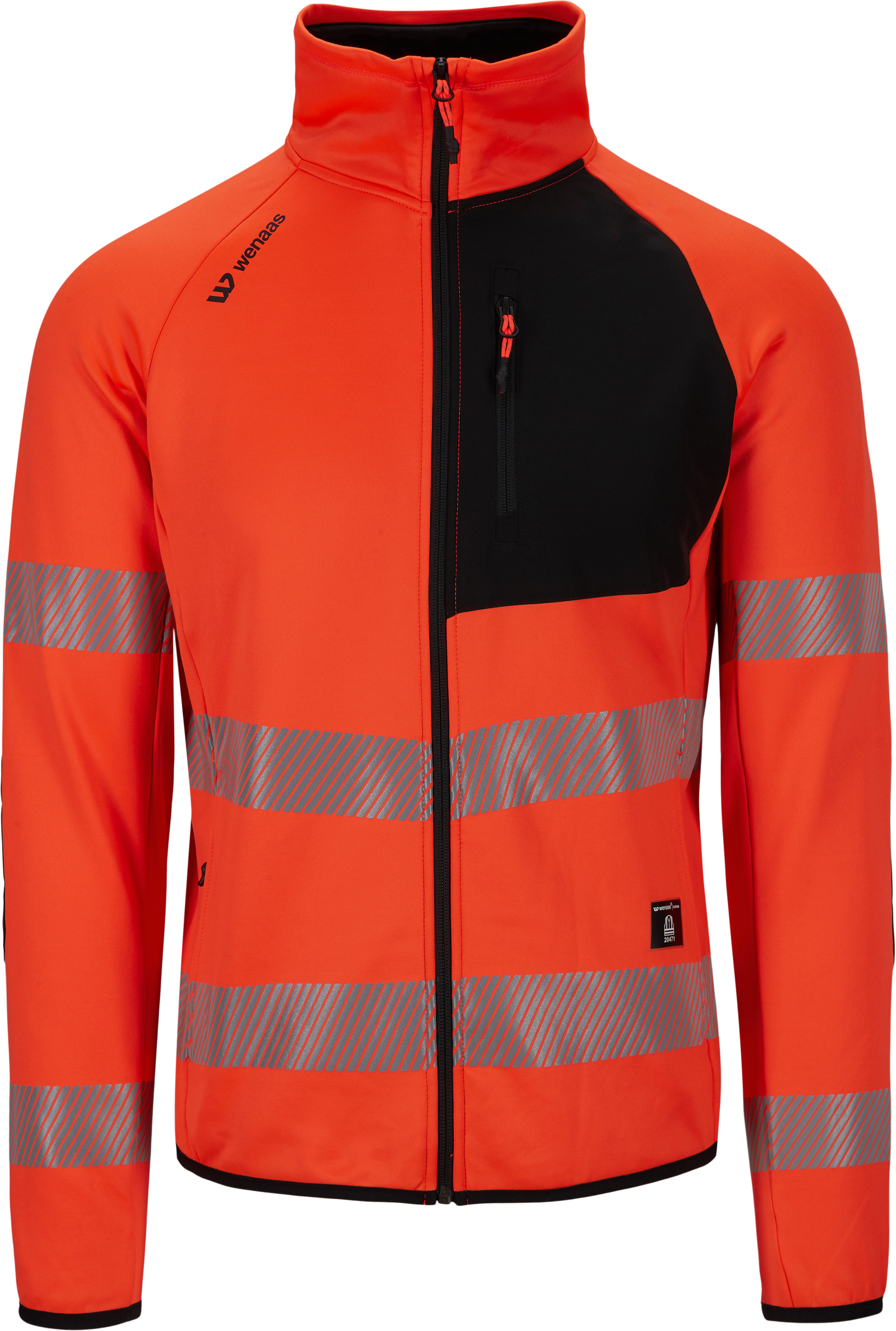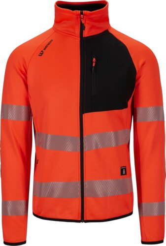 Form-stitched, ergonomically designed Hi-vis jacket in super-elastic, 4-way stretch fleece. Stand-up collar, zip closure at front, and long raglan sleeves. Contrasting elasticated chest panel on left side, chest pocket, two front pockets with zip, reinforcements at elbows, narrow elasticated ribbing at cuffs and hem, and reflective bands at two heights on torso and sleeves.