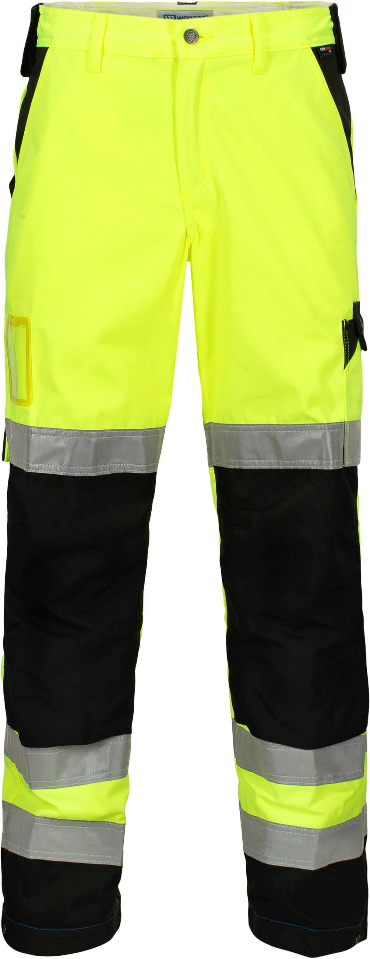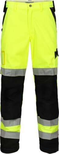 Hi-vis work trousers with metal button at the front, belt loops, 1 large hammer holder on both sides, zip fly and wedge inserted in the crotch for greater mobility, 2 side pockets, 2 back pockets, 1 hammer holder, 1 ruler pocket, 1 pen pocket, 1 small knife holder, 1 double thigh pocket with flap, 1 ID card pocket, knee pockets, reflective panel around calf and thigh, adjustable 5cm leg length and leg width with snap fastening