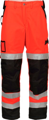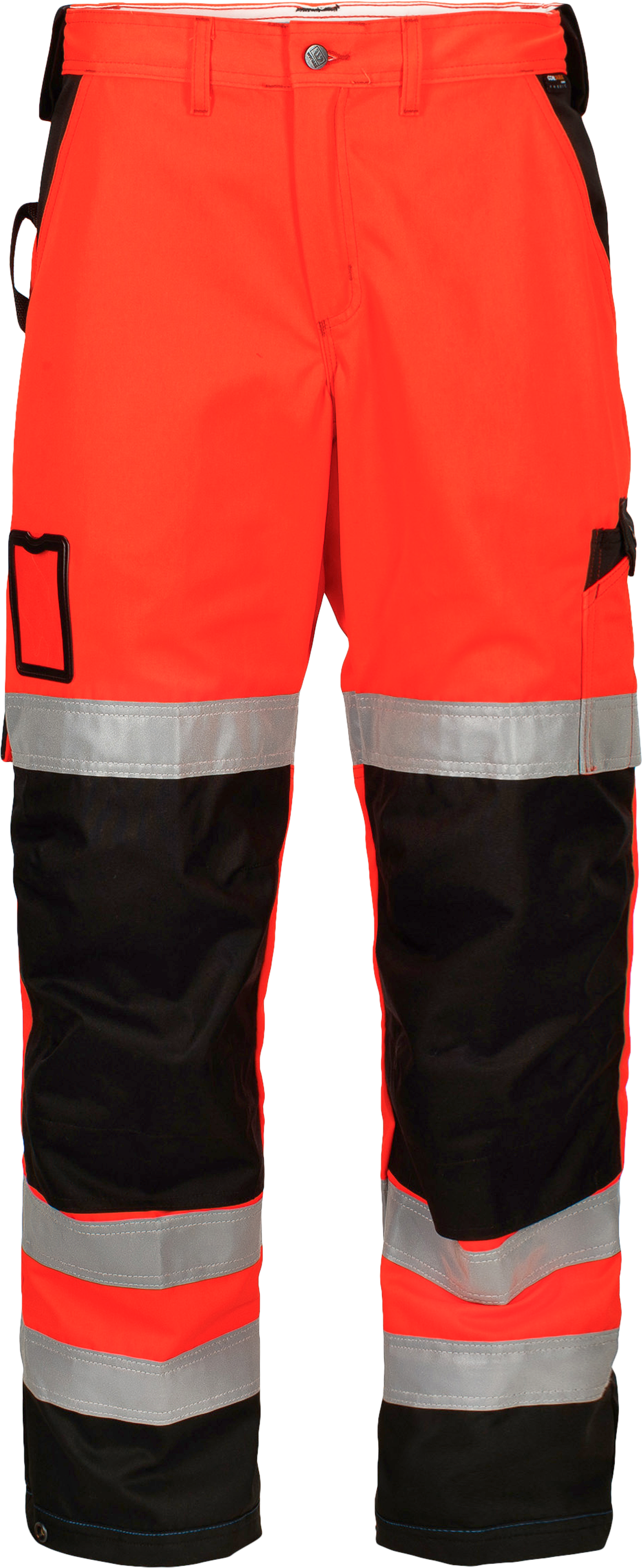 Hi-vis work trousers with metal button at the front, belt loops, 1 large hammer holder on both sides, zip fly and wedge inserted in the crotch for greater mobility, 2 side pockets, 2 back pockets, 1 hammer holder, 1 ruler pocket, 1 pen pocket, 1 small knife holder, 1 double thigh pocket with flap, 1 ID card pocket, knee pockets, reflective panel around calf and thigh, adjustable 5cm leg length and leg width with snap fastening