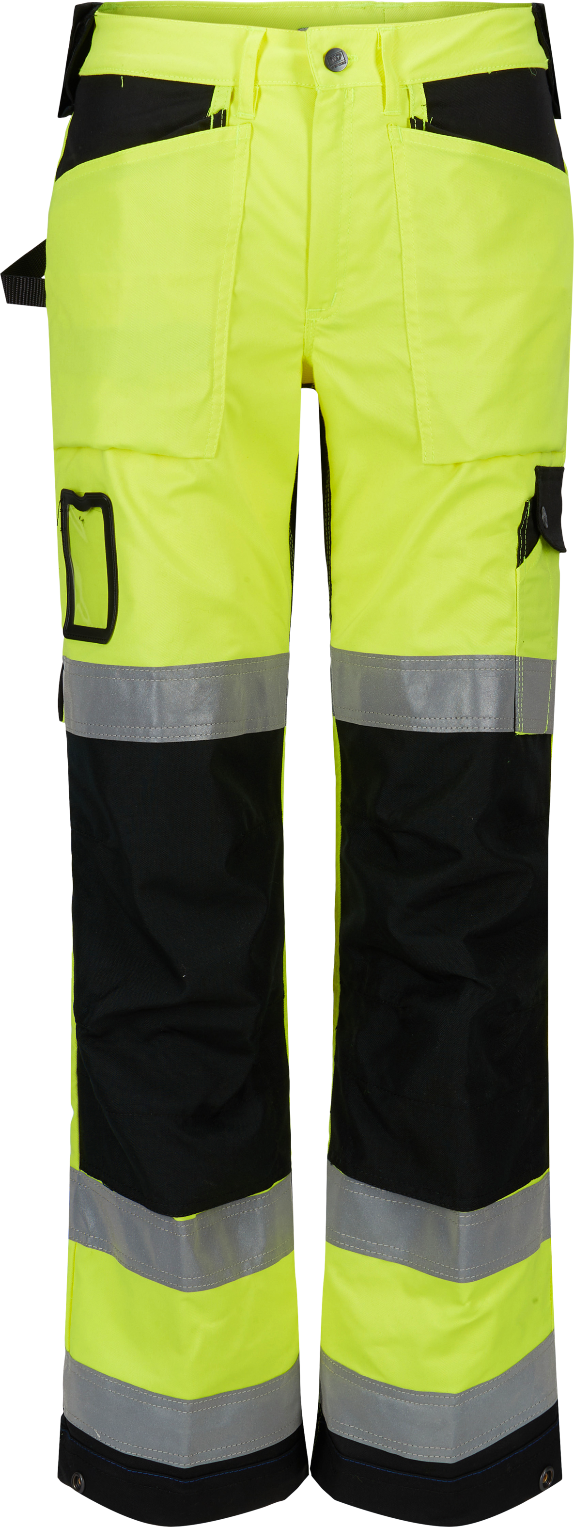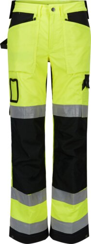 Trousers, ladies, with belt loops, 1 large hammer loop on both sides, zip in fly and 1 metal button at the waist. 2 back pockets, 2 front pockets, 2 double hanging pockets, right side pocket with tool loops at front. The hanging pocket can be hidden inside other front pockets. At the right side, 1 tools pocket, 1 pen pocket, 1 hammer loop, and 1 knife loop. On right thigh 1 double hip pocket, and 1 ID-card pocket. Knee pad pockets, adjustments of the width and length of the legs, and 3 reflex tape around the legs.