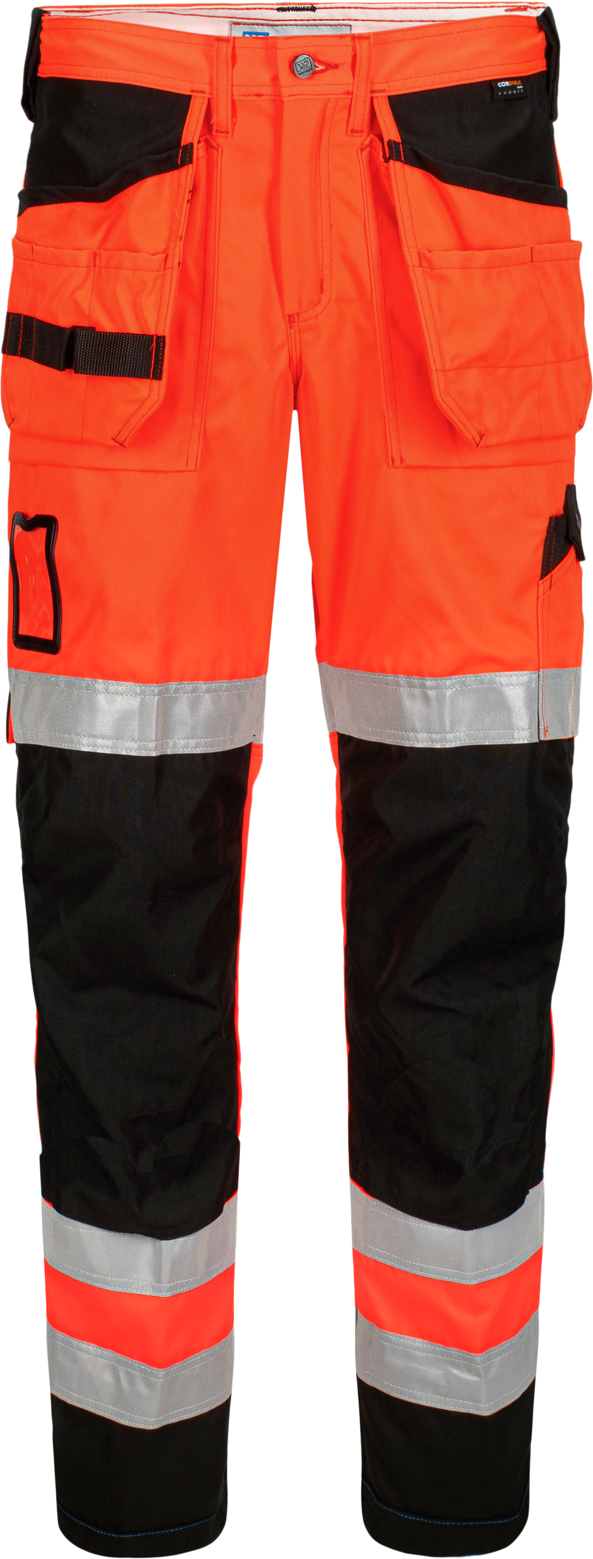 Craftsman trousers approved for visibility class 2. Durable trousers with a waistband, belt loops, and zip fly. Double hanging pockets, back pockets, and a hammer loop under the right back pocket. A ruler pocket with a hammer loop and knife holder, double hip pocket, and knee pockets. Reflective bands on the thighs and double reflective bands around the legs. Adjustable leg width and extra fabric for extension.