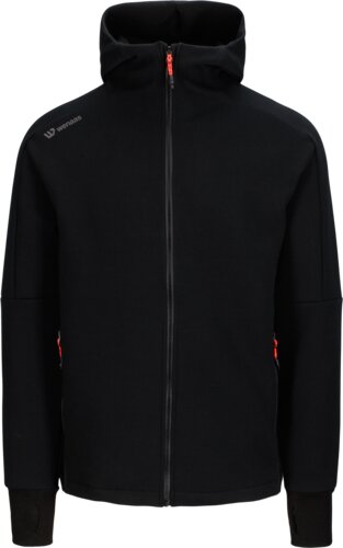 Stretch fleece jacket, standing collar with hood, zipper in the front, long Ragland sleeves, reinforcement on elbows, thumb holes. Two front pockets with zipper and elastic Wenaas ribbing on lower back.