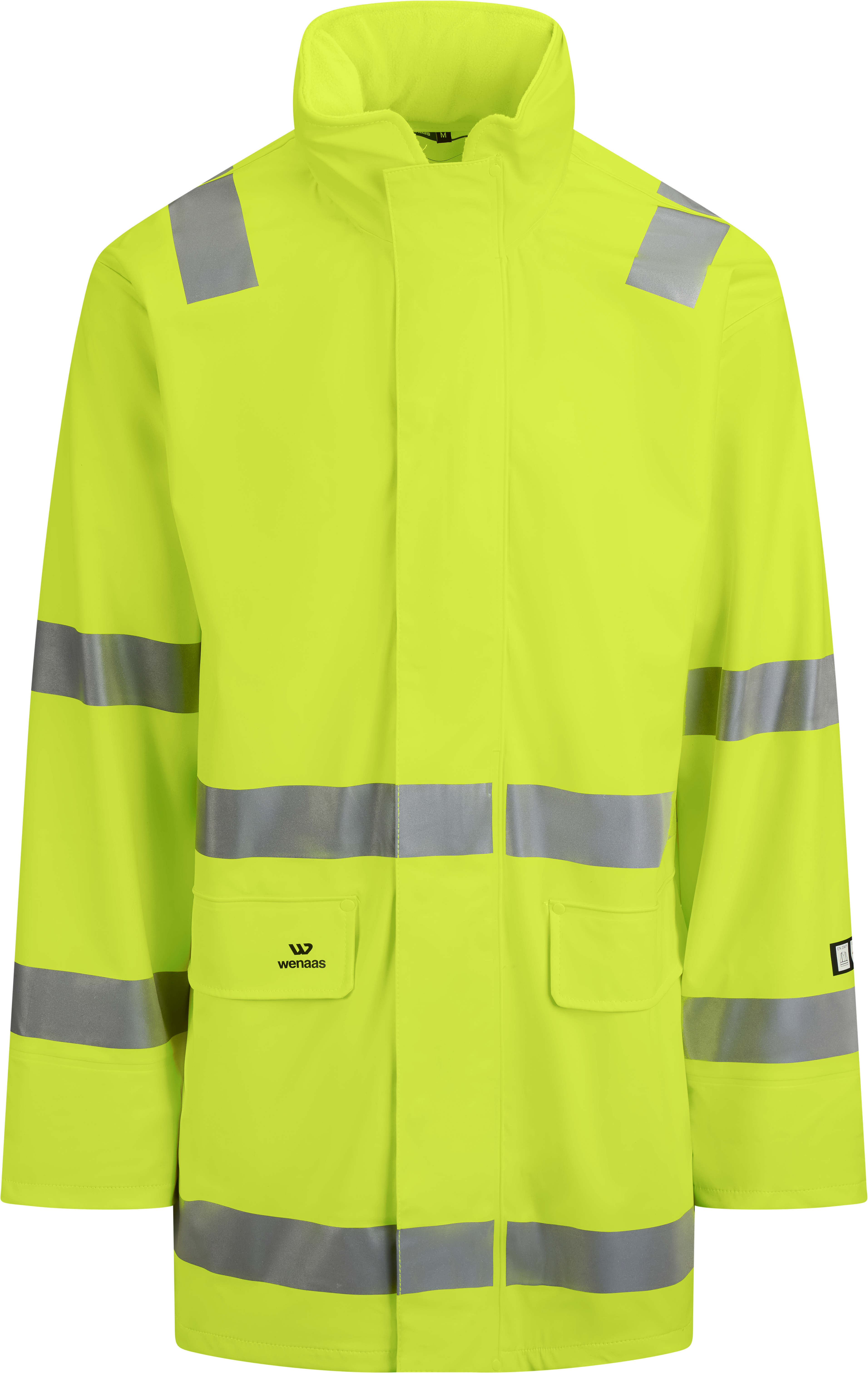 Hi-vis rain jacket with hood suitable for helmets. The hood can be hidden in the collar. Front pockets with flap. Welded seams, weld reinforcement in seam cross section under the arm and on top of the pocket flaps so the user stays nice and dry. Hidden cuffs in sleeves retain warmth in cold and rainy weather.
