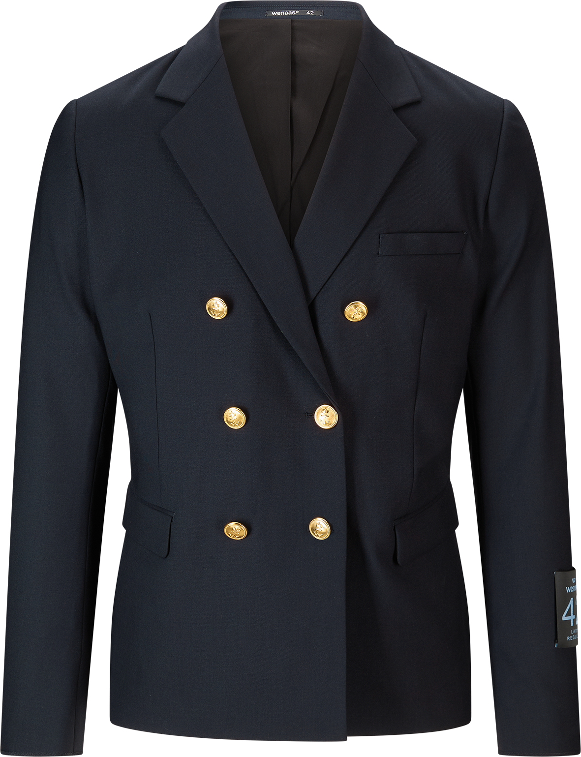 Classic double-breasted blazer with a slightly fitted waist for a feminine silhouette. Features anchor buttons, functional pockets and raw sleeve length for adding rank stripes. Durable wool blend that keeps its shape.