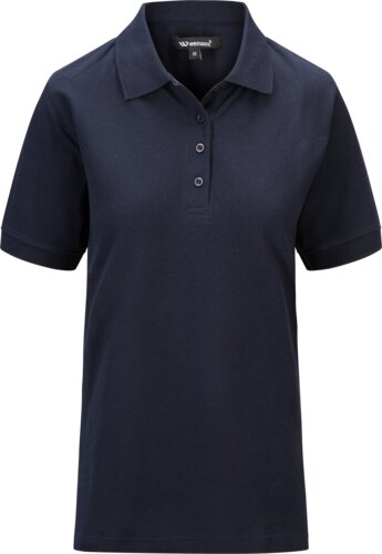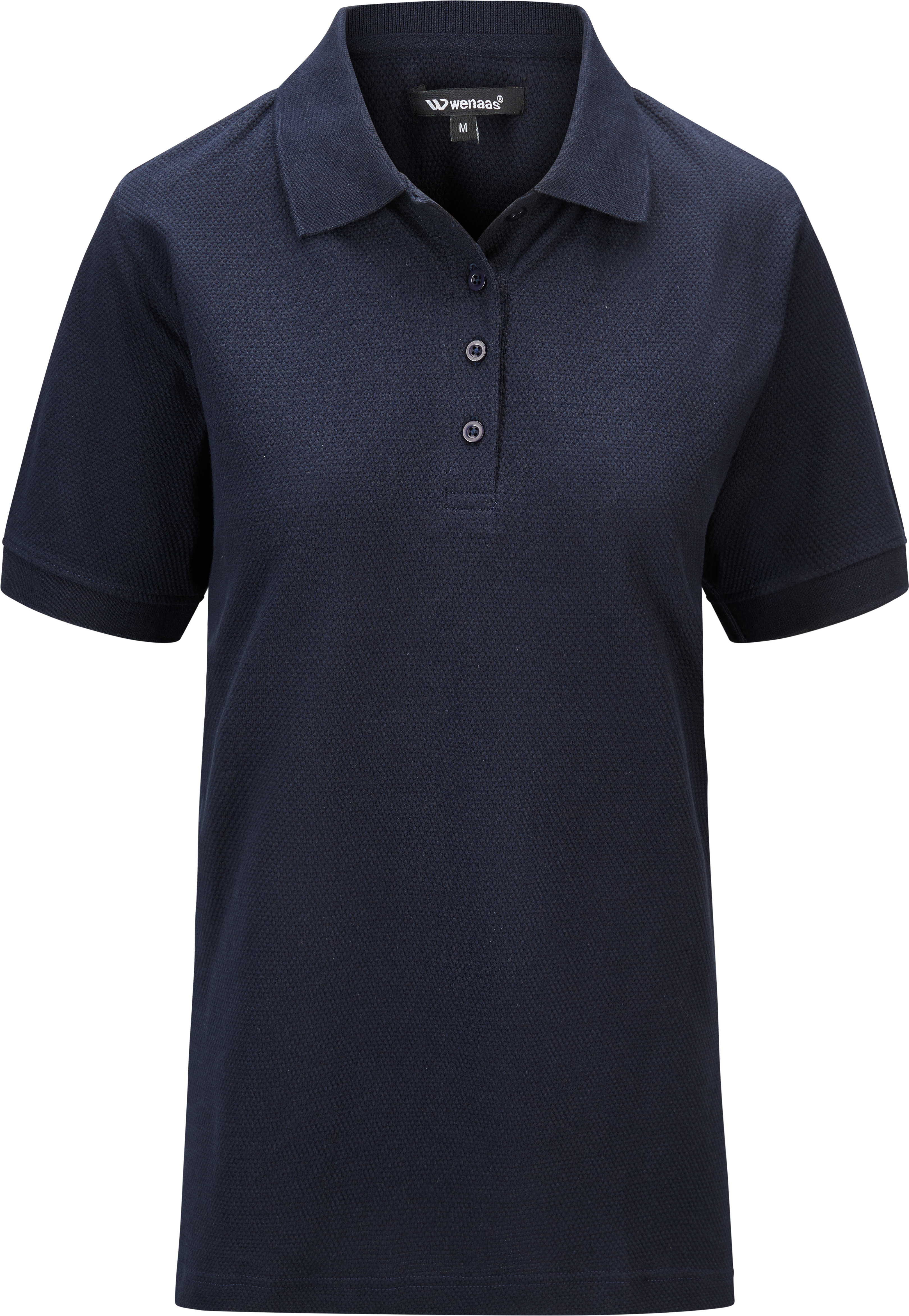 Women´s polo T-shirt with short sleeves, 3 matching, opalescent buttons, ribbed cuffs, and slits at sides, Concealed seam inside collar with contrasting band and reinforcing seams at sides.