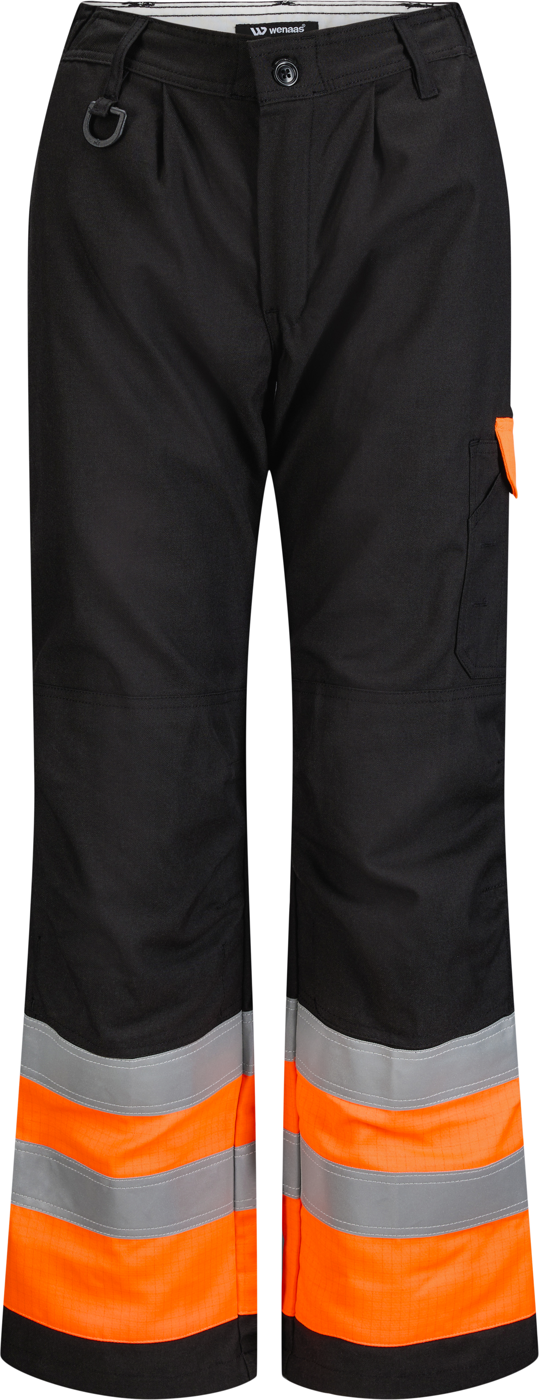 This model has a waistband, belt loops, a button in the front, and a zip-in fly. It also has cross pockets in the front, pockets at the back, one with flaps, a double tool pocket with button and knife loop, a double hip pocket with a flap, a pen pocket, a mobile pocket, knee pad pockets, and double reflex around the legs.