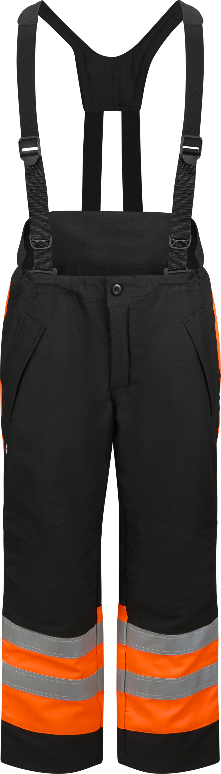 Winter trousers with a padded lining, an elastic waistband, and an elevated back. Elastic detachable braces with a fix-lock at the front, buttons at the waist, and a zipper in the fly. The trousers feature slanted front pockets with flaps, back pockets with flaps, and knee pads. A slit in the leg closes with a hidden two-way zipper, an internal snow stopper, adjustable width at the bottom of the legs, and two reflective tapes on the legs.