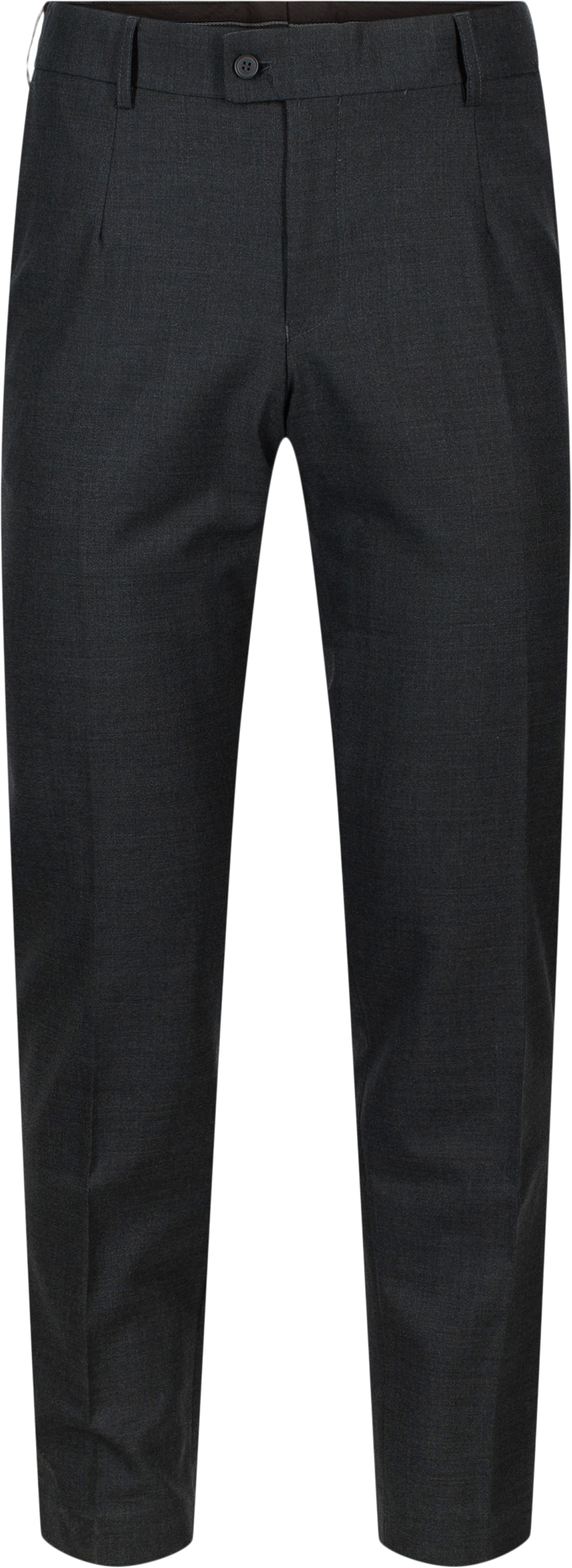 Regular men's trousers with stretch, to slash pockets in the front and two double besom pockets in the back with button closure. Waistband with silicone on the inside. The trousers have a zipper, button and a hook and eye in the front. The trousers are lined with elasticated lining down to the knees both in the front and back, which provides additional comfort and improved mobility.