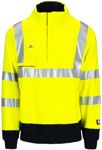 Multinorm sweater with good mobility. Standing contrast collar, short opening in front with a hidden zipper cover by a flap. Chest pocket with zipper cover by small flap, knitted ribbed cuffs at the end of sleeves and bottom hem, side panels with a 4 cm opening for improved movement, segmented reflex on shoulders, body and sleeves.