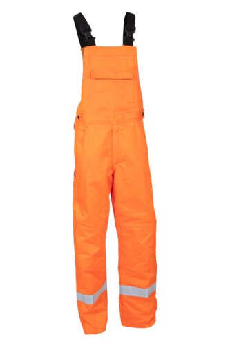 This trouser features a bib with one outside pocket with a flap and one inside pocket with a zipper. The front has a waistband with hidden buttons on the sides and a zip fly. The trousers are higher in the back with an elastic brace at the top, secured with fix-locks at the front bib. Front pockets with grip openings and an additional pocket; the openings are adjusted by press studs on the grip openings. Back pockets; one with flap, double tool pockets, knee pad pockets with downward openings, and reflexes around legs.