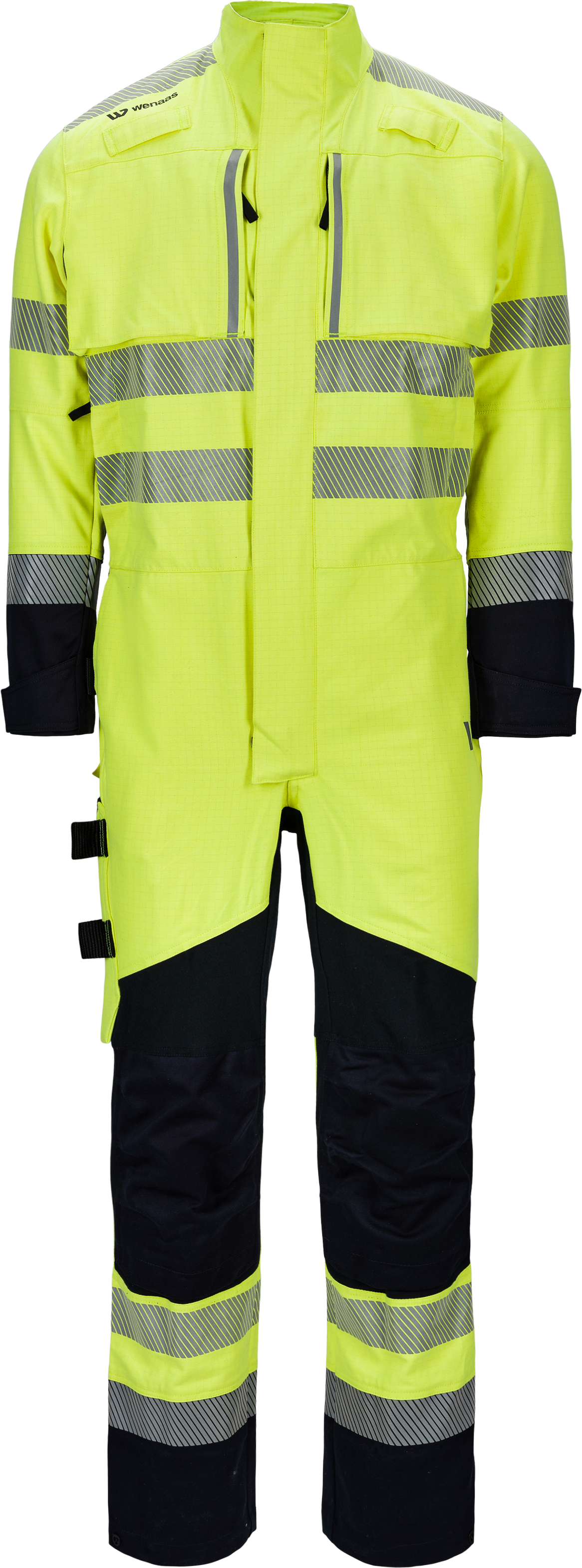Multinorm stretch coverall, stand-up collar, front zipper up to the top of the collar, yoke at the front and back, radio loop on both sides at the front, chest pocket with zipper, thin reflective stripe and loop on each pocket, front pockets with zipper, internal mesh pocket with zipper, map pocket with internal mobile phone pocket, loop and buttonhole for radio wire, map pocket closes with a zipper under the front flap, back pockets with flap, mesh under back pockets for ventilation, front side pockets with pass-through openings, tool pocket with web tool loops, knife button, knee pad pockets with two levels, adjustable width at the cuffs and legs, double reflective tape on the legs, sleeves, and torso, angled reflective stripe at the shoulders, 4-way stretch.