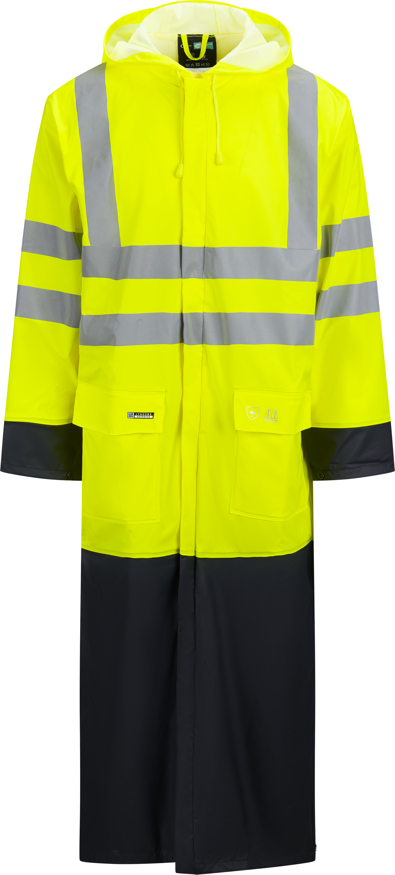 Long Hi-Vis raincoat with PU coating – windproof, waterproof and built for full coverage in wet and stormy conditions.