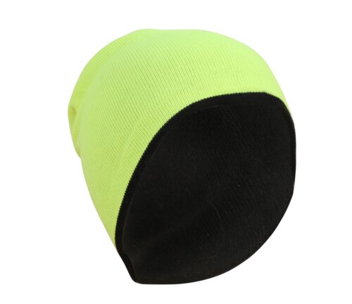 Beanie, knitted and reversible. Yellow on one outside, alternatively black with yellow bord.