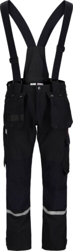 Vind and waterproof rain trousers with taped seams in a breathable stretch quality. These trousers have a high back piece, adjustable and removable braces, a waistband with belt loops, and elastic on both sides. The trousers closed with one button in front and zipped fly. Front pockets with flap, and one with zipper on left side, removable hanging tool pockets, back pockets with flap, one back pocket with zipper on top of right back pockets, hip tool pocket with hammer and knife loops on the right side, and double cargo tool pockets with flap on the left side. Modell has kneepad pockets, reflex tape around the legs, zip at the bottom of the legs, and adjustment at the leg hem.