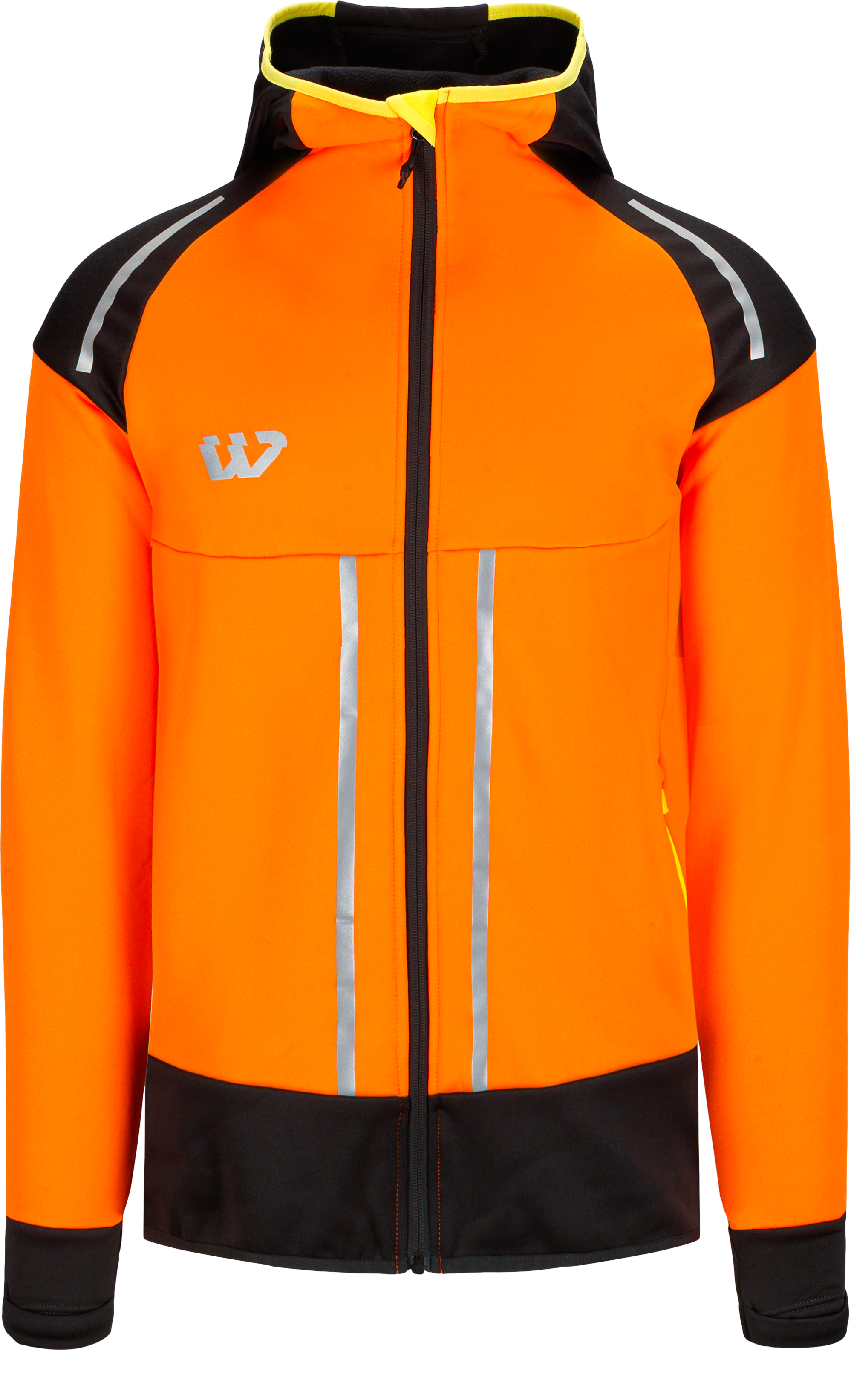 Stretch fleece jacket, tight fitting, with a standing collar with hood, zipper in the front, long ragland sleeves, thumb holes, two front pockets with zipper, contrasting material in the back panel, extended back and small reflective details for extra visibility.