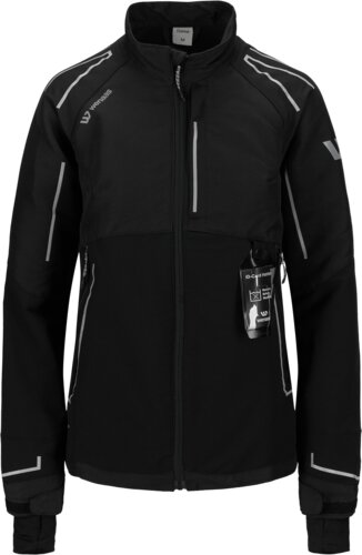 This lady’s stretch jacket has a standing collar, ''CURVED'' - embroidery logo at the collar’s center back, a front zipper up to the collar top, a flap under the zipper for protection, reinforced sleeves elbow, rib cuffs with a thumb opening, and straps for adjustment at the hemline. Chest pocket, and front pockets with zippers. A curved body fit, a lengthened back, with adjustment of the width at the bottom waistline, a reflective logo, and slim decorative reflective stripes on the front, the back, and the sleeves for better visibility and protection.