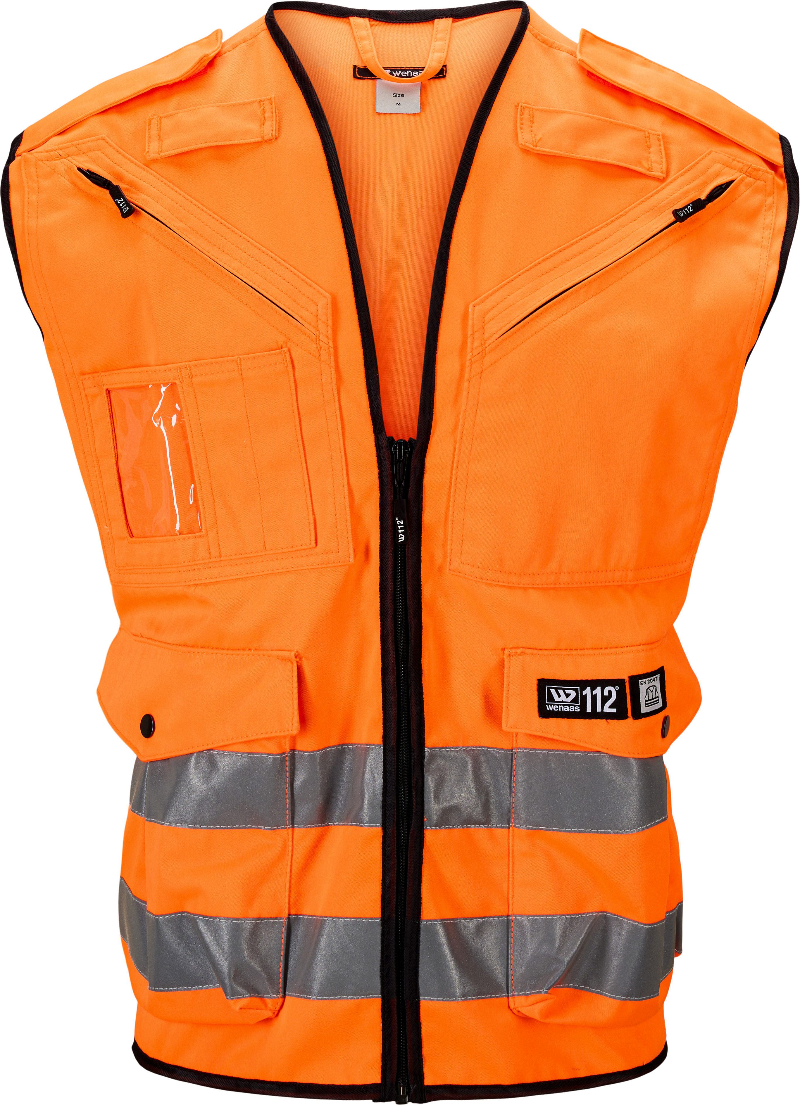 Durable uniform vest with front zipper. Breathable material on the back. Two chest pockets with zipper, one with pencil pockets, ID-card pocket. Two front pockets with side opening and snap button. Adjustable hem. Two reflective strips for improved visibility.