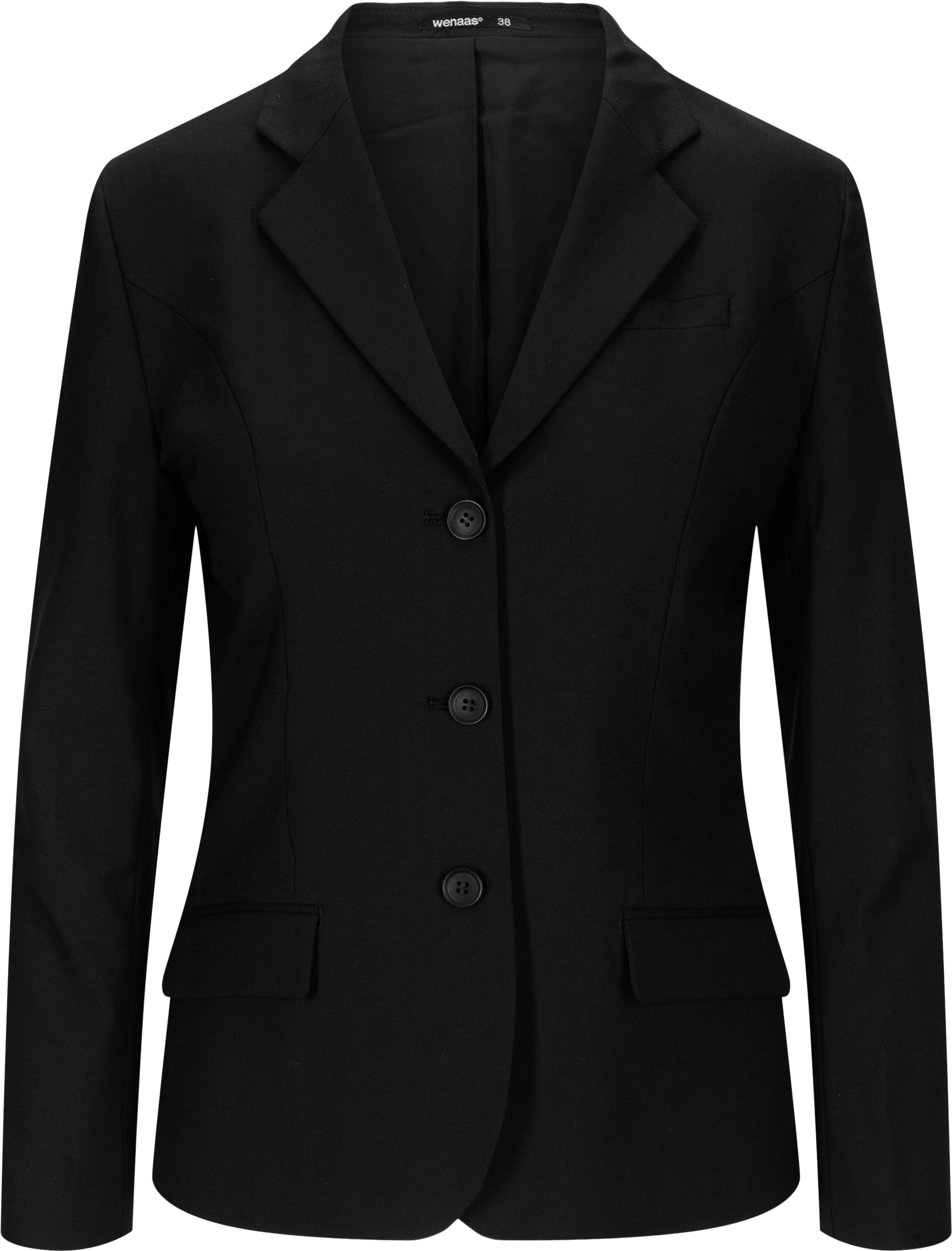 Tailored single-breasted blazer with stretch for women. Jacket with collar and three practical pockets in the front, two besom pockets with flaps and one chest pocket. Sleeves with two seams with closed slits and three decorative buttons on sleeves. Princess seams in the front and back and closes with three buttons in the front Two practical inner pockets and elasticated lining inside for improved mobility.